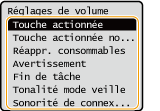 <Tonalité mode veille> | Signal sonore émis lorsque l'appareil passe en mode veille ou lorsque l'appareil est mis hors tension si vous définissez <Régl. démar. rapide à la mise ss tension> sur <Oui>. (Selon les cas, l'appareil ne démarre pas rapidement et le signal sonore n'est pas émis.) |