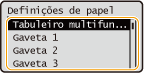 Se o tamanho/tipo de papel exibido for diferente do tamanho/tipo de papel carregado, selecione <Def. de papel> e a origem do papel em que o papel está carregado.