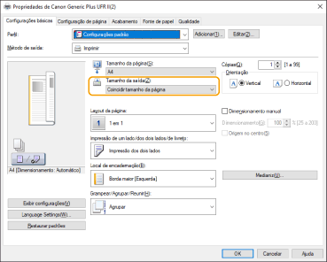 Ajuste [Tamanho da saída] no driver da impressora com o tamanho do papel em que deseja imprimir.