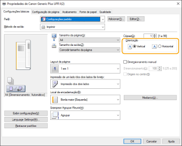 2 | Na tela [Configurações básicas] do driver, configure [Orientação] na mesma orientação configurada na etapa 1. |