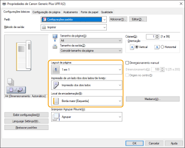 3 | Enquanto verifica a visualização da impressão, configure [Layout da página] [Ordem das páginas] [Impressão de um lado/dos dois lados/de livreto] [Local de encadernação]. |