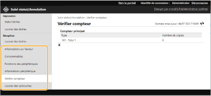 Vous pouvez vérifier diverses informations sur la machine, comme des informations d'erreur, la quantité restante de papier et d'encre, des informations sur l'équipement optionnel relié et le nombre total de pages qui ont été imprimées jusqu'à maintenant.