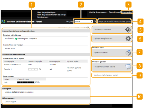 Certains éléments et fonctions de l'affichage ne sont disponibles que si vous vous connectez avec des privilèges Administrateur. Si plusieurs utilisateurs utilisent l'interface utilisateur distante en même temps ou si le panneau de commande de l'appareil est utilisé en même temps que l'interface utilisateur distante, la dernière opération exécutée est appliquée. |