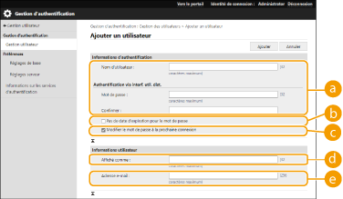 Un utilisateur avec «Administrator» comme nom d'utilisateur est mémorisé par défaut en tant qu'utilisateur avec des privilèges d'administrateur. Cet utilisateur «Administrator» ne peut pas être supprimé, mais il peut être désactivé après avoir ajouté un autre utilisateur avec les privilèges «Administrator». Si l'utilisateur «Administrator» est désactivé, vous ne pouvez pas changer les réglages que seul l'utilisateur «Administrator» peut configurer, sur le panneau de commande de la machine.