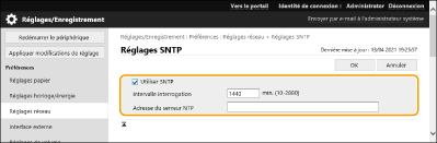 Le protocole SNTP (Simple Network Time Protocol) vous permet de régler l'horloge du système en utilisant le serveur de temps sur le réseau. Si SNTP est utilisé, le serveur de temps est vérifié aux intervalles spécifiés ; par conséquent, l'heure correcte peut toujours être maintenue. Les paramètres SNTP peuvent être spécifiés via l'interface utilisateur distante.