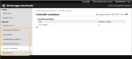È possibile verificare un gran numero di informazioni sulla macchina, ad esempio informazioni sugli errori, quantità di carta e toner rimanenti, informazioni sulle apparecchiature opzionali collegate e numero totale di pagine che sono state stampate finora.