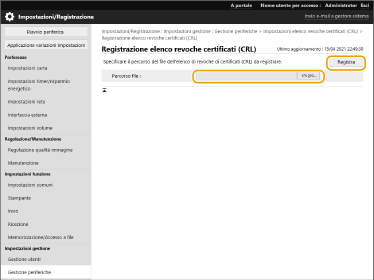 È possibile utilizzare la IU remota per registrare un CRL (elenco di revoche di certificati). Per ottenere informazioni sui CRL che possono essere registrati sulla macchina, vedere