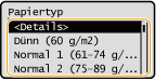 Um die genauen Einstellungen für einen Papiertyp zu prüfen, wählen Sie <Details> , um den zu kontrollierenden Papiertyp auszuwählen.