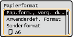 Wenn Sie das einzulegende Papier häufig ändern müssen, legen Sie <Sonderformat> fest; dies reduziert die Anzahl der Schritte, die zum Ändern der Einstellung erforderlich sind. Sie können auch eine Fehlermeldung ausgeben, wenn die Einstellung im Druckertreiber erheblich von dem eingelegten Papierformat abweicht. <Diskr. Pap.form. f. Pap.zuf. Sond.form.>