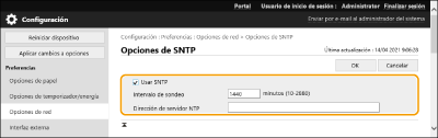 Simple Network Time Protocol (SNTP) le permite ajustar el reloj del sistema mediante el servidor de hora de la red. Si utiliza SNTP, se comprueba el servidor de hora a los intervalos especificados; por lo tanto, siempre se puede mantener la hora correcta. Las opciones de SNTP pueden especificarse a través de la IU remota.