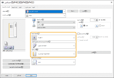 أثناء التحقق من معاينة الطباعة، قم بتعيين [تخطيط الصفحة]‏ [ترتيب الصفحات]‏ [طباعة على وجه واحد/على الوجهين/الكتيبات]‏ [مكان التجليد].