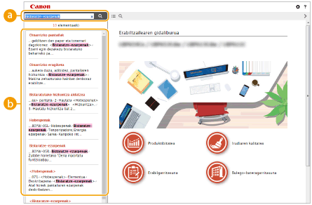 bilaketa-pantaila bistaratzeko. Gakoen bidezko bilaketak burutzeko testu-lauki bat dauka, bilatzen ari zaren orrialdea aurkitzeko.