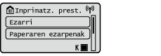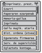 Aldatu egin ditzakezu pantailari dagozkion ezarpenak; adibidez, makina PIZTU ostean berehala zein pantaila agertzen den, eta mezurik agertzen den gelditzen den paper eta tonerrari dagokionez. <Bistaratze-ezarpenak>