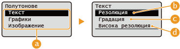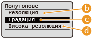 | <Резолюция> Създава отпечатани изображения с по-гладка градация и очертания. Този режим е подходящ за плавно отпечатване на фигури и графики с използване на градация. |