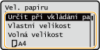 Pokud do tlačítek <S1> až <S5> uložíte často používané velikosti papíru, můžete je vyvolat výběrem možnosti <Uložené velikosti>.Uložení volné velikosti papíru (Vlastní velikosti papíru) do paměti stroje