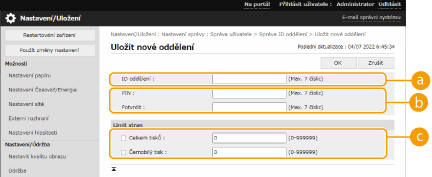 Pokud se přihlásíte s právy administrátora (správce), ID a PIN správce systému se automaticky přiřadí a zpracují jako ID oddělení.