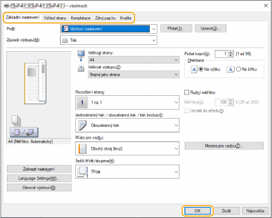 Požadovaná nastavení tisku zadávejte na jednotlivých kartách, které můžete podle potřeby přepínat.