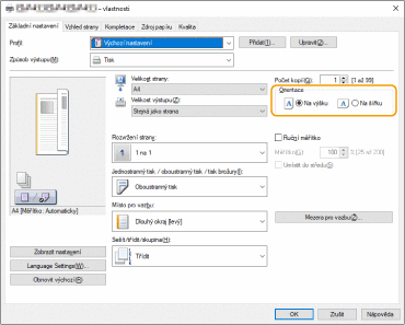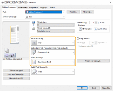 Při kontrole náhledu tisku nastavte [Rozvržení strany] [Pořadí stránek] [Jednostranný tisk / oboustranný tisk / tisk brožury] [Místo pro vazbu].