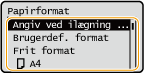<Fejl i papirstør. til Frit format>Ved registrering af papir med standardformat