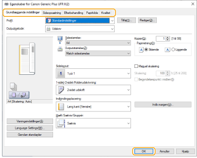 Skift faner efter behov for at angive de ønskede printningsindstillinger.