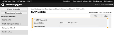 Ha az SNTP nincs beállítva, a gép bizonyos szolgáltatások használata esetén külső SNTP-kiszolgálót hívhat az óra szinkronizálásához.