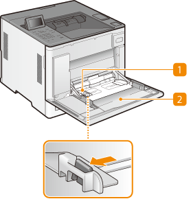 Sureguliuokite popieriaus kreiptuvus tiksliai pagal įdėto popieriaus plotį, kad popierius būtų tiekiamas tiesiai į aparatą. Paspauskite paveikslėlyje rodykle pažymėtą fiksavimo atleidimo svirtį, kad atlaisvintumėte fiksatorių ir pastumtumėte popieriaus kreiptuvus.