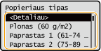 Norėdami peržiūrėti išsamius popieriaus tipo parametrus, pasirinkite <Detaliau>
