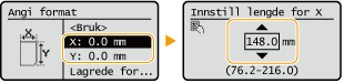 | Velg <X> eller <Y> for å angi lengden på hver side med de numeriske tastene eller  /  . |