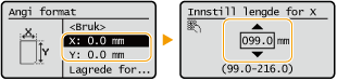 | Velg <X> eller <Y> for å angi lengden på hver side med de numeriske tastene eller  /  . |