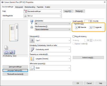 2 | På [Grunninnstillinger]-skjermen til driveren stiller du inn [Papirretning] til samme orientering som du stilte inn i trinn 1. |