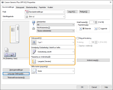 3 | Sjekk utskriftsforhåndsvisningen og still inn [Sideoppsett] [Siderekkefølge] [1-sidig/2-sidig/Utskrift av hefte] [Plassering av innbinding]. |