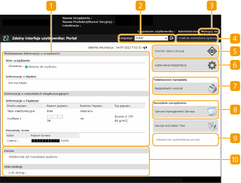 Podczas korzystania z interfejsu Remote UI (Zdalny interfejs użytkownika) do obsługi urządzenia, nie należy korzystać z przycisku [Powrót] przeglądarki. Jeżeli skorzystasz z przycisku [Powrót] strona może być zmieniana nieprawidłowo.