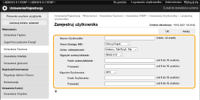 Jeśli włączone są obie wersje protokołu SNMP, zalecane jest wybranie w ustawieniach uprawnień dostępu do obiektów menedżera MIB dla protokołu SNMPv1 opcji [Tylko do odczytu]. Uprawnienia dostępu do obiektów menedżera MIB dla protokołów SNMPv1 i SNMPv3 można ustawiać oddzielnie (a także osobno dla każdego użytkownika w przypadku protokołu SNMPv3). Wybranie opcji [Odczyt/Zapis] (uprawnienie pełnego dostępu) dla protokołu SNMPv1 anuluje wydajne funkcje zabezpieczeń protokołu SNMPv3, ponieważ większością ustawień urządzenia można wtedy zarządzać za pomocą protokołu SNMPv1.
