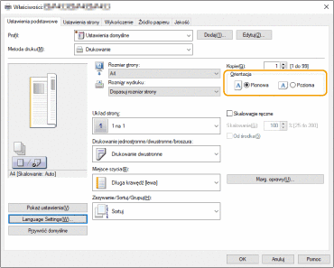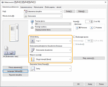 Sprawdzając podgląd wydruku, ustaw kolejno opcje [Układ strony] [Kolejność stron] [Drukowanie jednostronne/dwustronne/broszura] [Miejsce szycia].