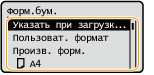 Если требуется часто менять загружаемую бумагу, выберите <Произв. форм.>; это уменьшит количество шагов, которые необходимо выполнять каждый раз для изменения параметра. Можно также настроить отображение сообщения об ошибке, если настройка в драйвере принтера будет значительно отличаться от формата загруженной бумаги.