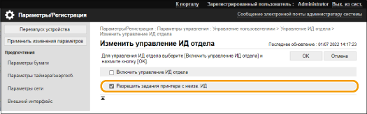 Установите этот флажок, чтобы принимать задания на печать от драйверов принтера, которые не поддерживают функцию «Управление ИД отдела».