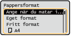 Om du ofta behöver byta papper, ställ in på <Fritt format>; detta minskar antalet steg som krävs för att ändra inställningen varje gång. Du kan även visa ett felmeddelande när inställningen i skrivardrivrutinen är betydligt annorlunda än storleken på påfyllt papper. <Misspass. pappersstorl. f fri pappersk.>