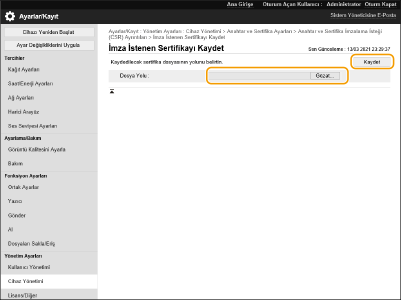 Makine üzerinde bir anahtar ve CSR oluşturabilirsiniz. Ayrıca, CSR verilerini ekranda görüntüleyebilir ve dosya olarak aktarabilirsiniz.