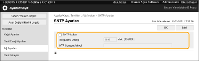 Basit Ağ Zamanı Protokolü (SNTP), ağ üzerindeki zaman sunucusunu kullanarak sistem saatini ayarlamanıza olanak sağlar. SNTP kullanılırsa, zaman sunucusu belirtilen aralıklarla kontrol edilir ve bu sayede doğru zaman her zaman korunabilir. SNTP ayarları, Uzak Kullanıcı Arabirimi aracılığıyla belirtilebilir.