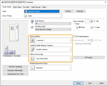 Baskı önizlemesini kontrol ederken [Sayfa Yerleşimi] [Sayfa Sırası] [1 taraflı/2 taraflı/Kitapçık Yazdırma] [Ciltleme Konumu] öğelerini ayarlayın.