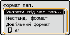 Якщо вам часто потрібно міняти папір для завантаження, установіть значення <Довільний формат>; це зменшить кількість кроків, які потрібно щоразу виконувати для зміни параметра. Також можна відображати повідомлення про помилку, коли параметри драйвера принтера значно відрізняються від формату завантаженого паперу.