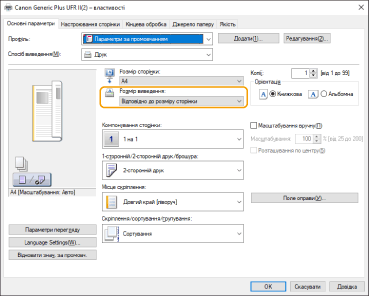Установіть значення [Розмір виведення] у драйвері принтера відповідно до формату паперу, на якому виконуватиметься друк.