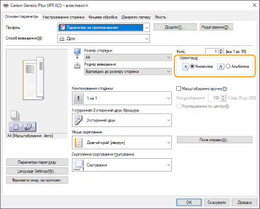 2 | На екрані [Основні параметри] драйвера встановіть для параметра [Орієнтація] таке саме значення орієнтації, що було встановлено під час кроку 1. |