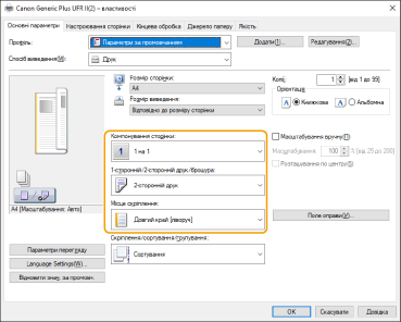 3 | Під час попереднього перегляду друку встановіть параметри [Компонування сторінки] [Порядок розташування сторінок] [1-сторонній/2-сторонній друк/брошура] [Місце скріплення]. |