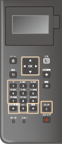 文字や数字を入力するときはテンキーを使います。なお、テンキーではカタカナしか入力できません。システム管理者名などに漢字やひらがなを使いたい場合はリモートUIから登録してください。