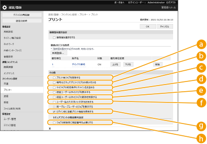 強制留め置き印刷の詳細設定をする留め置いた印刷文書の保存期間や表示方法などを詳細に設定することができます。<プリント> 一括インポート/エクスポートについて本設定は、一括インポートに対応した本設定が利用できる機種にインポート/エクスポートできます。 設定データをインポート/エクスポートする 一括エクスポート時、本設定は[設定/登録の基本情報]に含まれます。 設定内容を一括してインポート/エクスポートする |