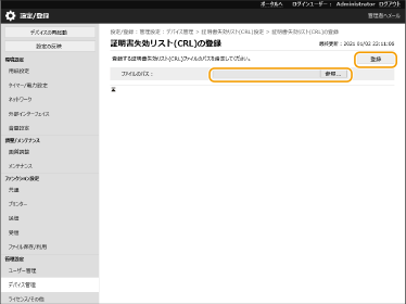 リモートUIから証明書失効リスト(CRL)を登録します。本機に登録可能な証明書失効リスト(CRL)については、
