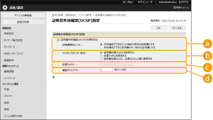 通信中の相手から受信した証明書が有効かどうかを検証するには、本体に登録した「証明書失効リスト(CRL)」と照合する方法と、OCSP(Online Certificate Status Protocol)レスポンダー(OCSPに対応したサーバー)に問い合わせる方法があります。お使いの環境に合わせて証明書の失効確認方法を設定してください。これらの登録は管理者が行ってください。