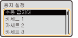 표시된 용지 크기/종류가 적재된 용지 크기/종류와 다른 경우 <용지 설정>을 선택하고 용지가 적재되는 급지 위치를 선택합니다.