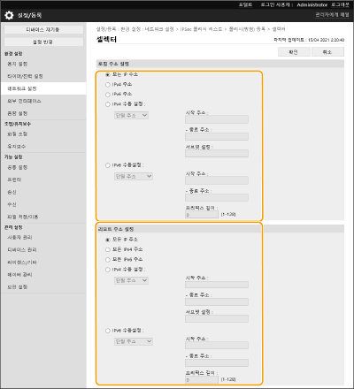 3 | IPSec을 적용할 포트를 지정합니다. ![]() IPSec을 적용할 포트를 지정할 때 포트 번호를 사용하려면 [포트번호로 지정]를 선택합니다. IPSec을 모든 포트 번호에 적용하려면 [모든 포트]을 선택합니다. IPSec을 특정 포트 번호에 적용하려면 [단일 포트]를 누르고 포트 번호를 입력합니다. [로컬 포트]에서 이 기기의 포트 번호를 지정하고 [리모트 포트]에서 통신 피어의 포트를 지정합니다. 서비스 이름으로 IPSec를 적용할 포트를 지정하려면 [서비스명으로 지정]을 선택하고 사용할 서비스를 선택합니다. | ||||||||||||||